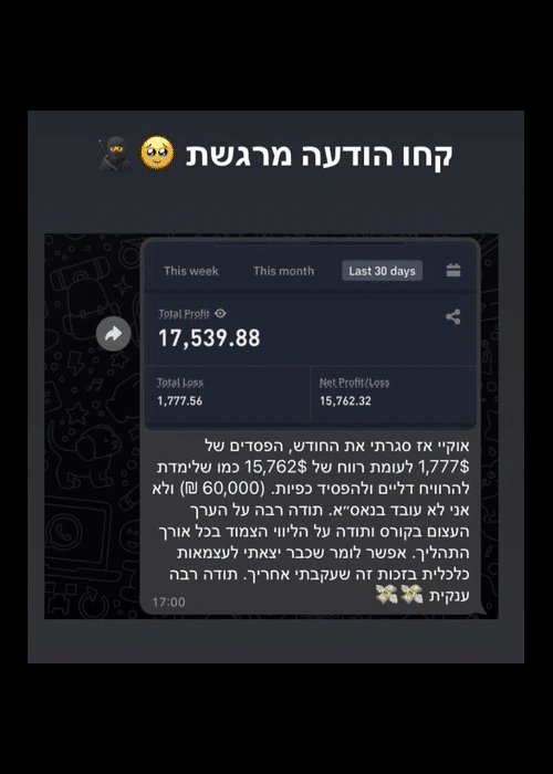 אצלי מקבלים ליווי צמוד ממני אישית ולא מאיזה מאמן מסחר שנכנס לתחום לפי שנתיים. זה אומר שאני אישית מעביר לכם את כל הידע שצברתי בשבע שנים האחרונות.